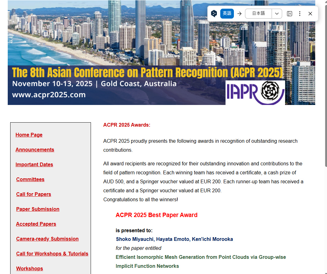 宮内翔子准教授がThe 8th Asian Conference on Pattern Recognition (ACPR) でBest Paper Awardを受賞しました。